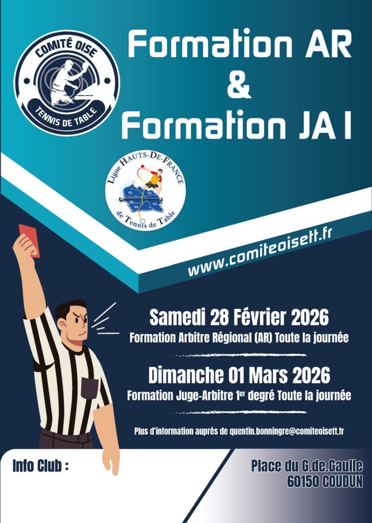 La Commission Régionale de l’Emploi et de la Formation avec le Comité de l’Oise Tennis de Table organise une formation « Arbitre Régional » le samedi 28 février 2026 à COUDUN (60) – Salle Multi-Fonction – Place du Général de Gaulle – 60150 COUDUN