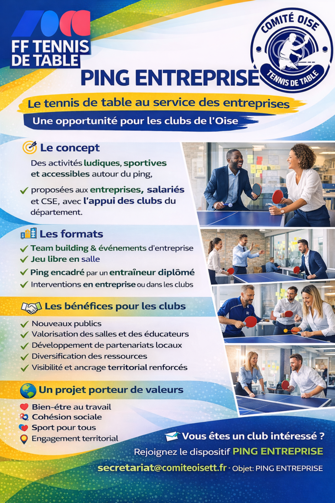 Alexis notre entraineur Comité et Eric notre agent de développement pourront vous solliciter pour recueillir vos infos sur votre capacité/volonté à accueillir des sessions de PING ENTREPRISE . Merci de leur réserver le meilleur accueil.