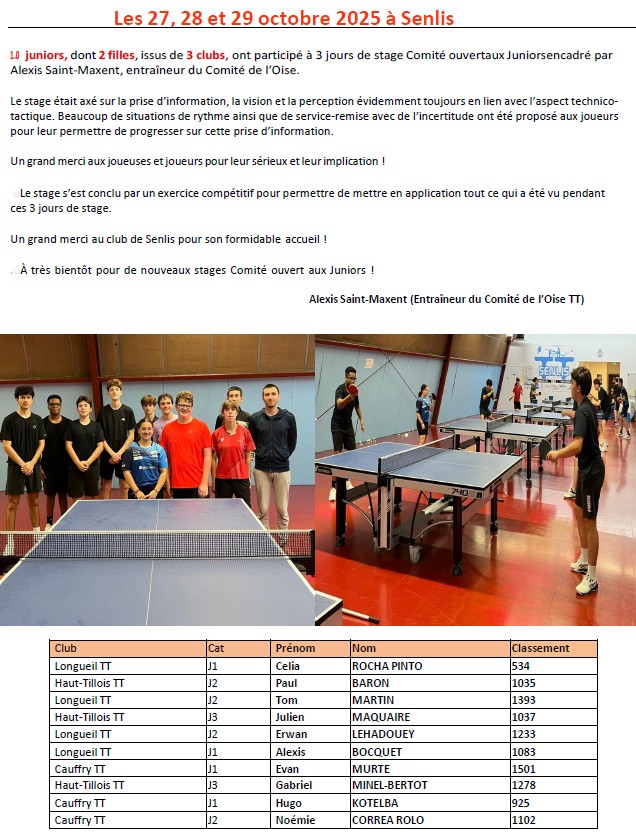 🏓Les 27, 28 et 29 octobre, Célia, Paul, Tom, Julien, Erwan, Alexis, Evan, Gabriel, Hugo et Noémie ont participé à 3 jours de stage Comité ouvert aux Juniors. Un niveau fort intéressant où la plupart des juniors ont pu se retrouver dans une ambiance de stage qu’ils ont bien connu et ont fourni un très bon travail dans une bonne ambiance !